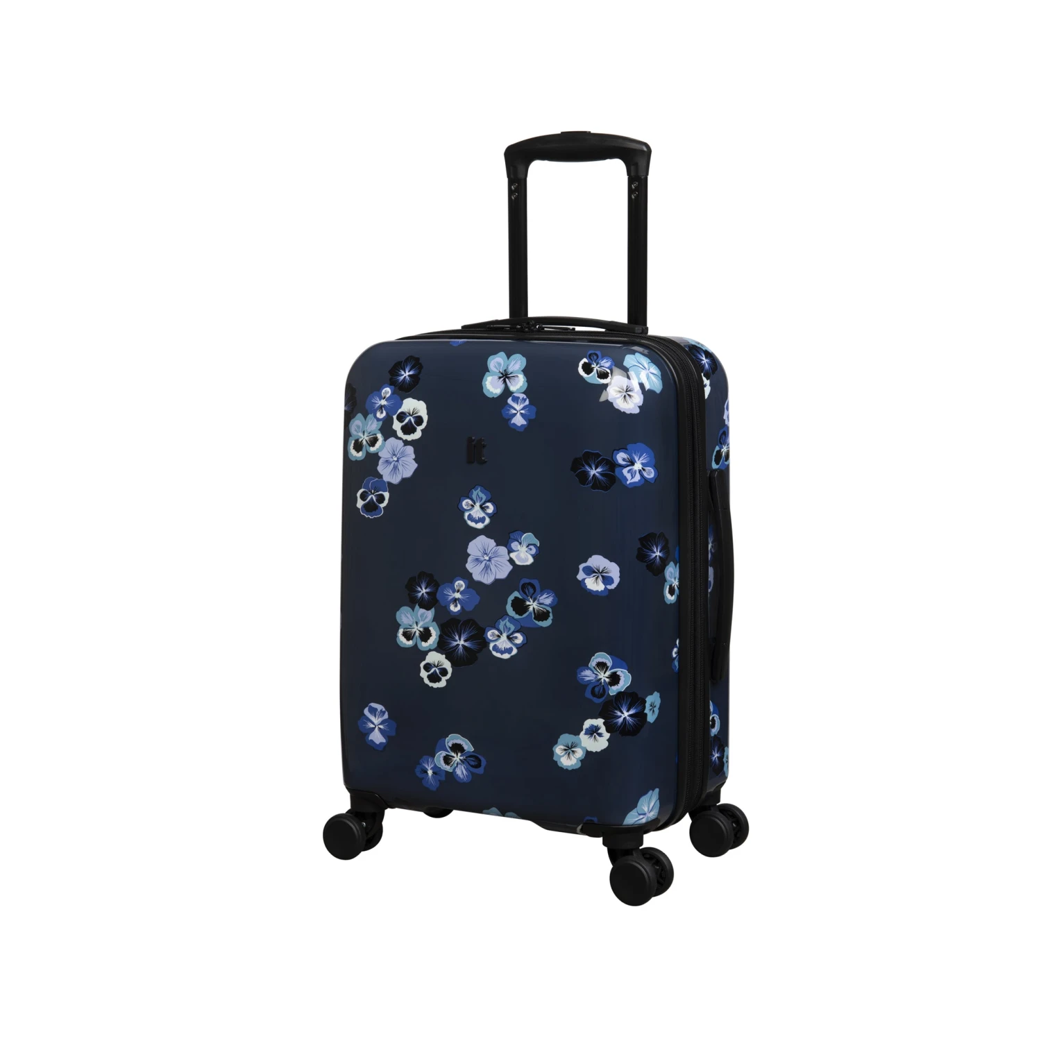 The matching set, comprising of cabin and large suitcases, features a beautiful and distinctive Pansies Floral pattern on a deep blue background.